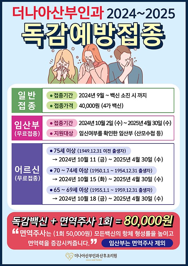 2024~2025 독감예방 접종 (임산부,어르신 무료) 페이지 정보 작성자 더나아산부인과 연락처 작성일 작성일24-09-12 14:08 목록 본문 2024~2025 독감예방 접종 (임산부,어르신 무료) 목록