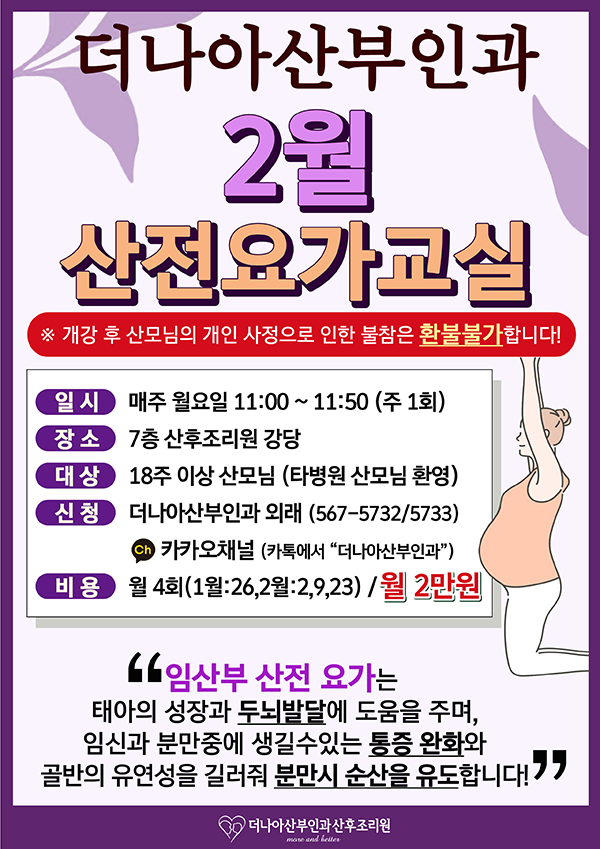2월 산전 요가 모집 (타병원 산모님 환영) 페이지 정보 작성자 더나아산부인과 연락처 작성일 작성일26-01-12 11:19 목록 본문 2월 산전 요가 모집 (타병원 산모님 환영) 목록